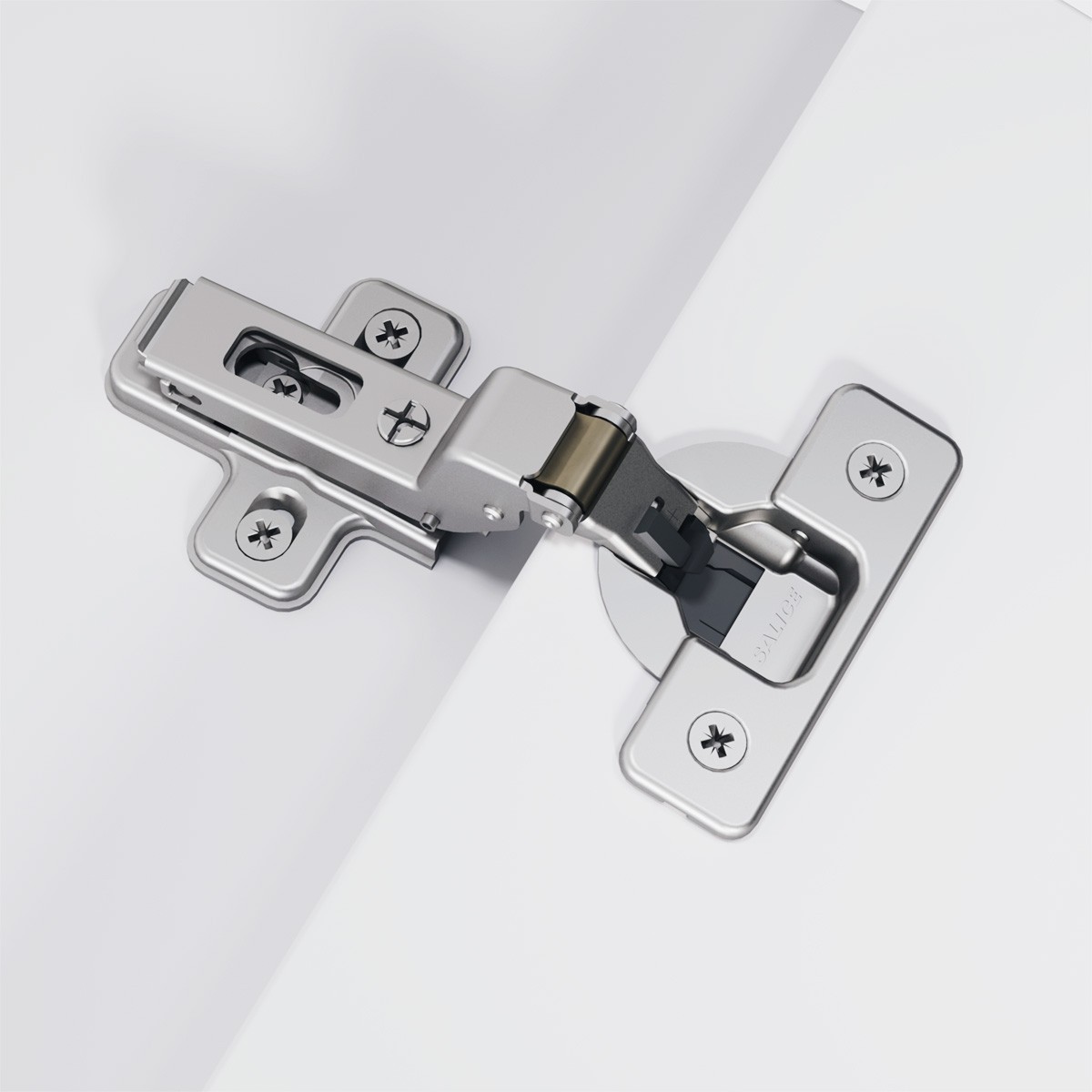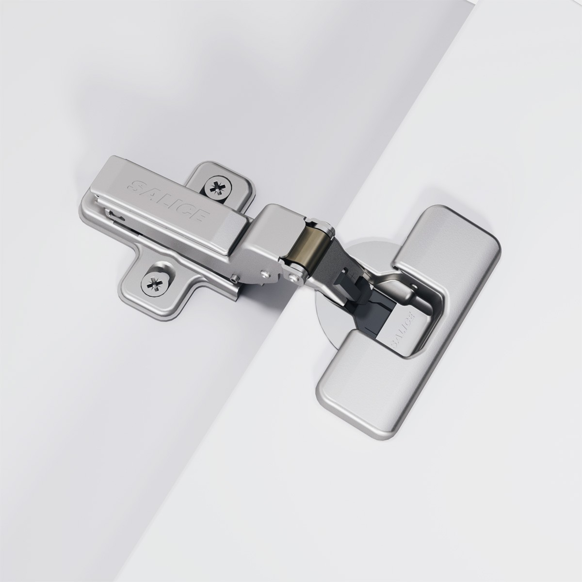 Designed for applications where doors are mounted at a 45° positive angle. featuring twin silicone oil dampers integrated within the cup for smooth and controlled closing. The deceleration can be easily adjusted via a simple switch.