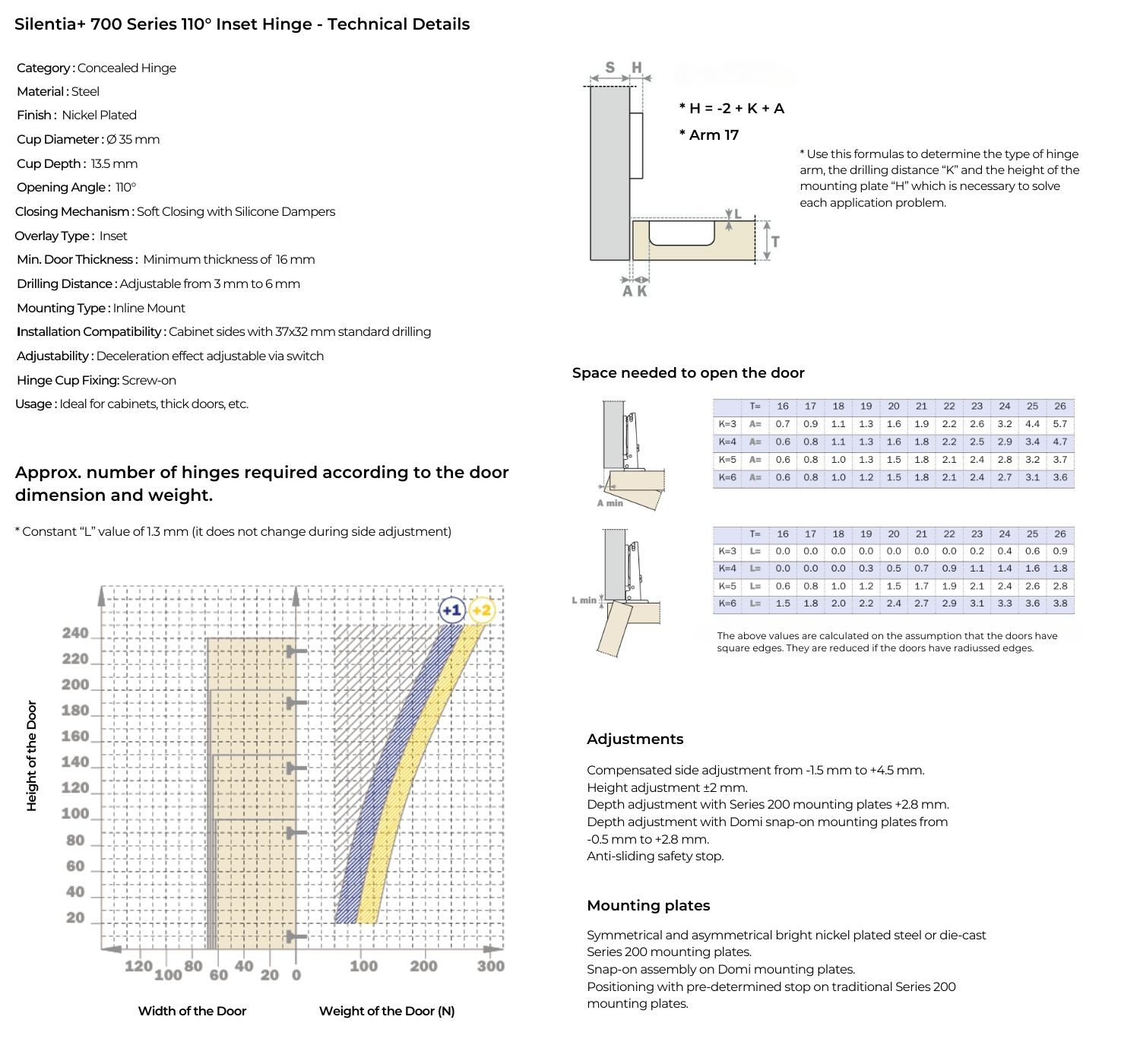 Supplied as a complete set including hinge, flange cover, screw cover, and inline mounting plate. The inline mounting plate features 3D adjustment for precise door...