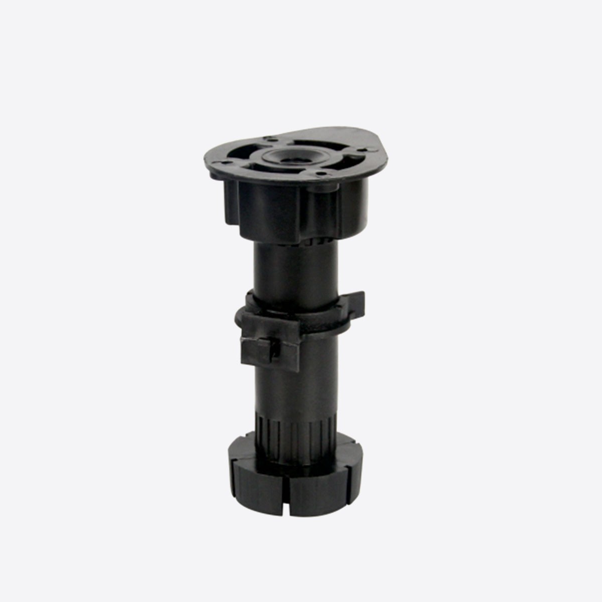 Durable adjustable leg designed for kitchen cabinets and furniture bases. Made from high-strength plastic with a secure mounting plate for stable support and easy installation. Height adjustment allows precise leveling on uneven floors.