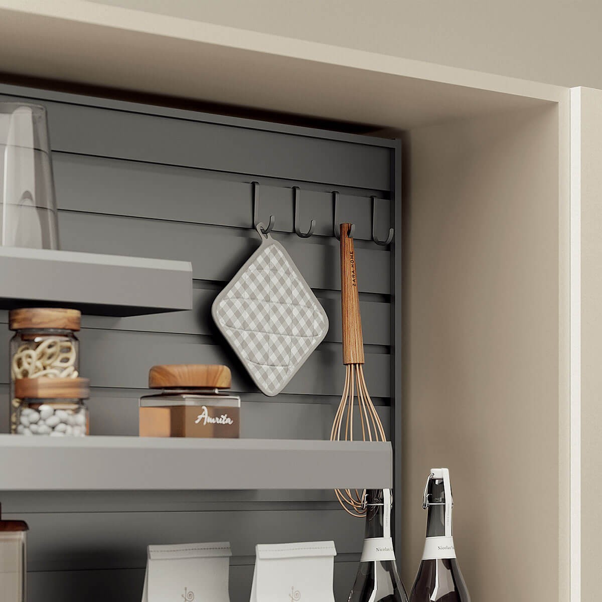 Electric lifting unit for overhead kitchen cabinets, enabling controlled vertical movement for improved accessibility. Featuring soft, silent mechanism and supports energy-efficient performance with an anti-pinch safety protection to prevent accidental injury. Shelves and hooks are modular—removable and adjustable—to accommodate varying storage requirements.